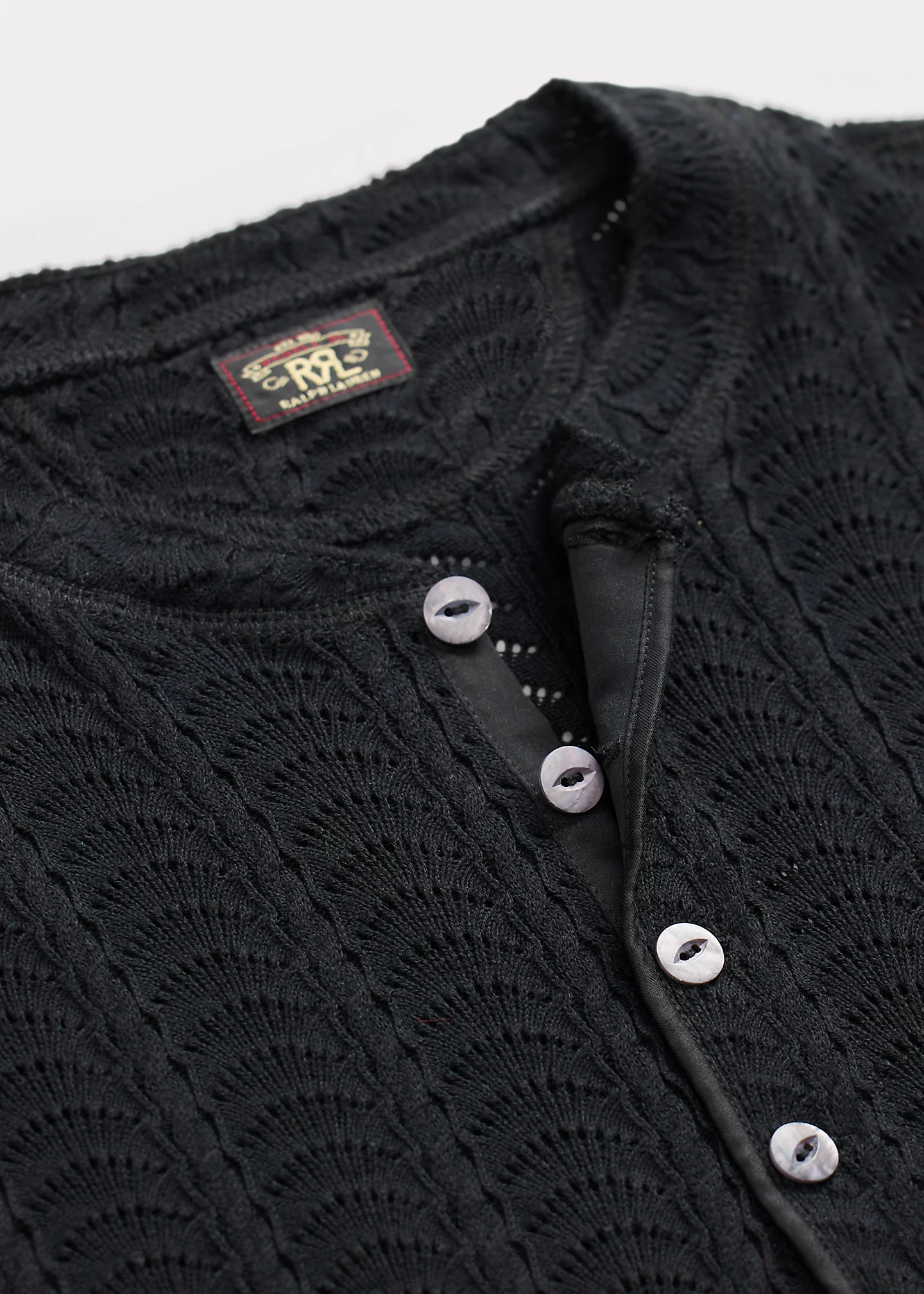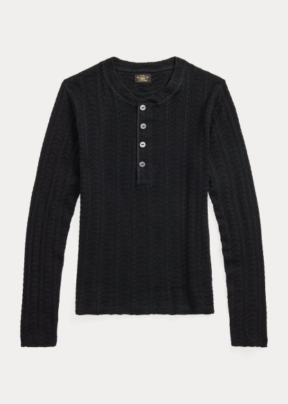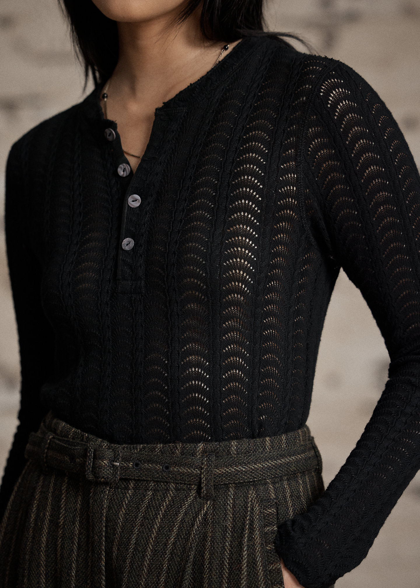 - Henley neckline. Four-button placket with satin binding and facing. River-shell buttons.