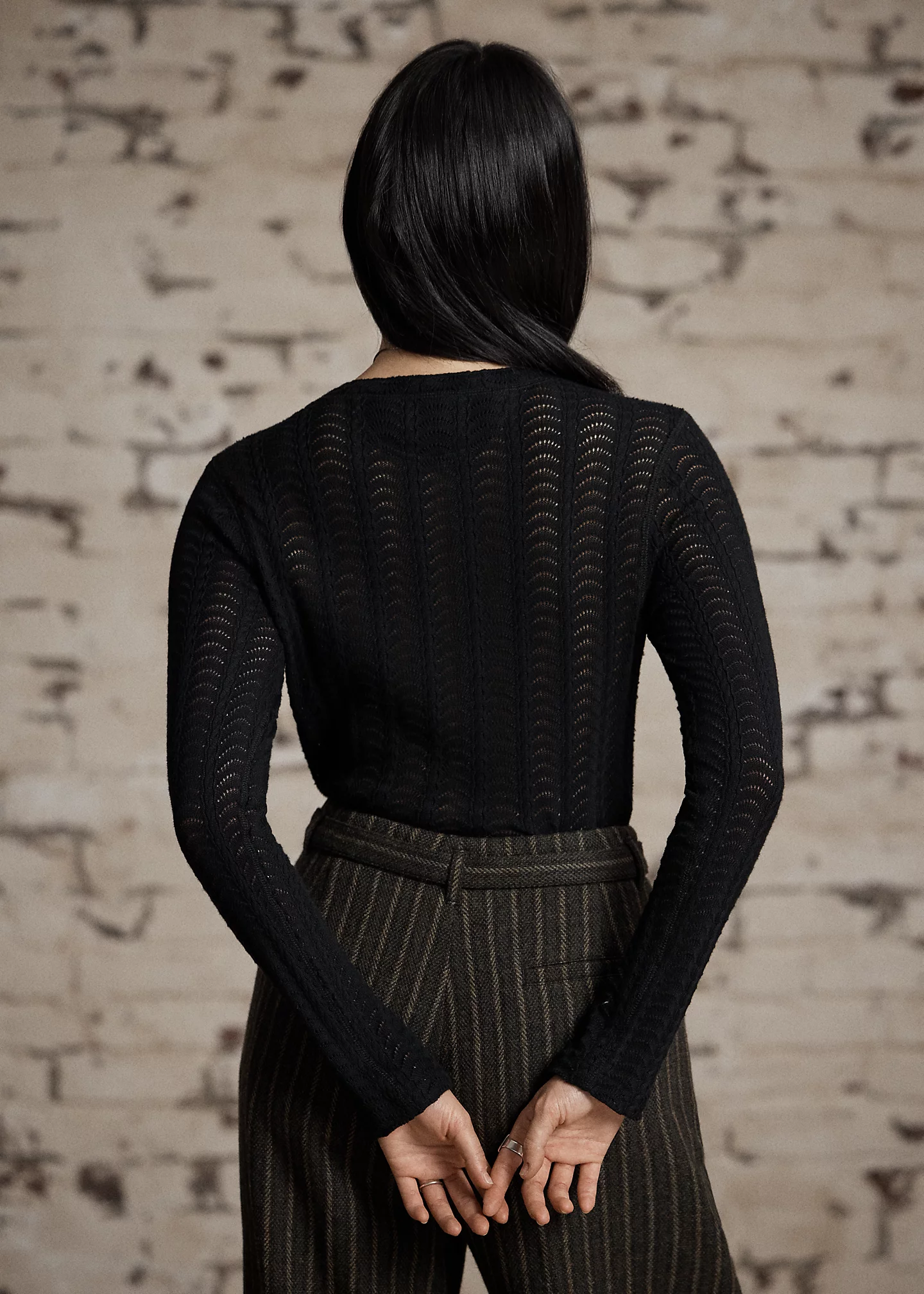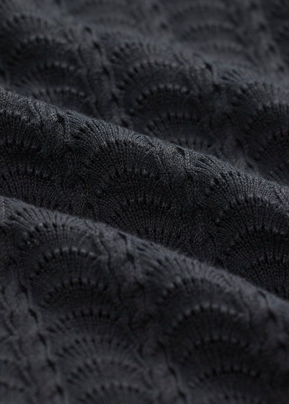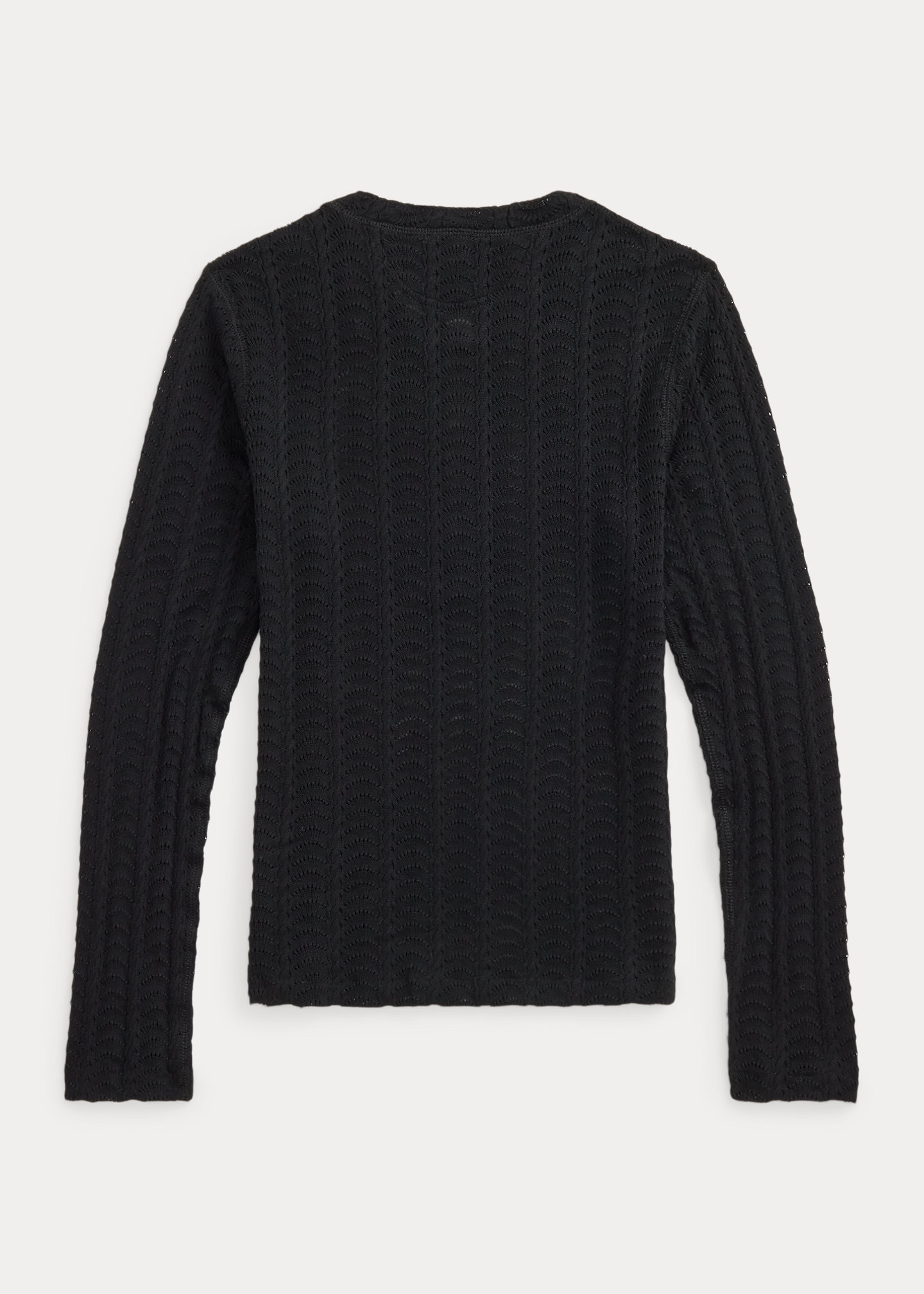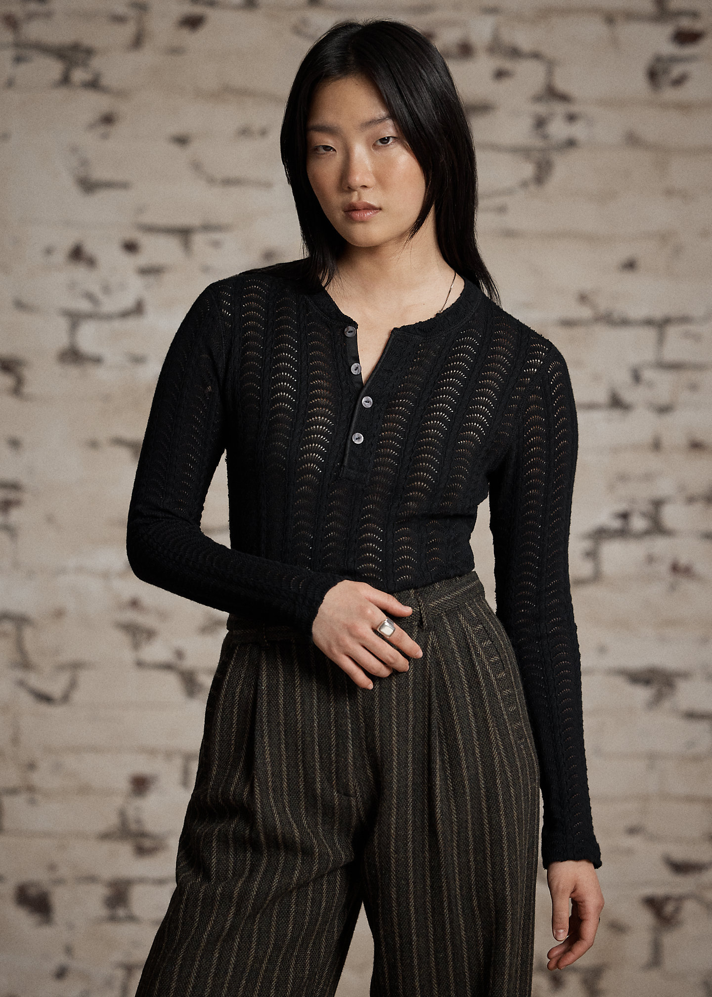 - Henley neckline. Four-button placket with satin binding and facing. River-shell buttons.