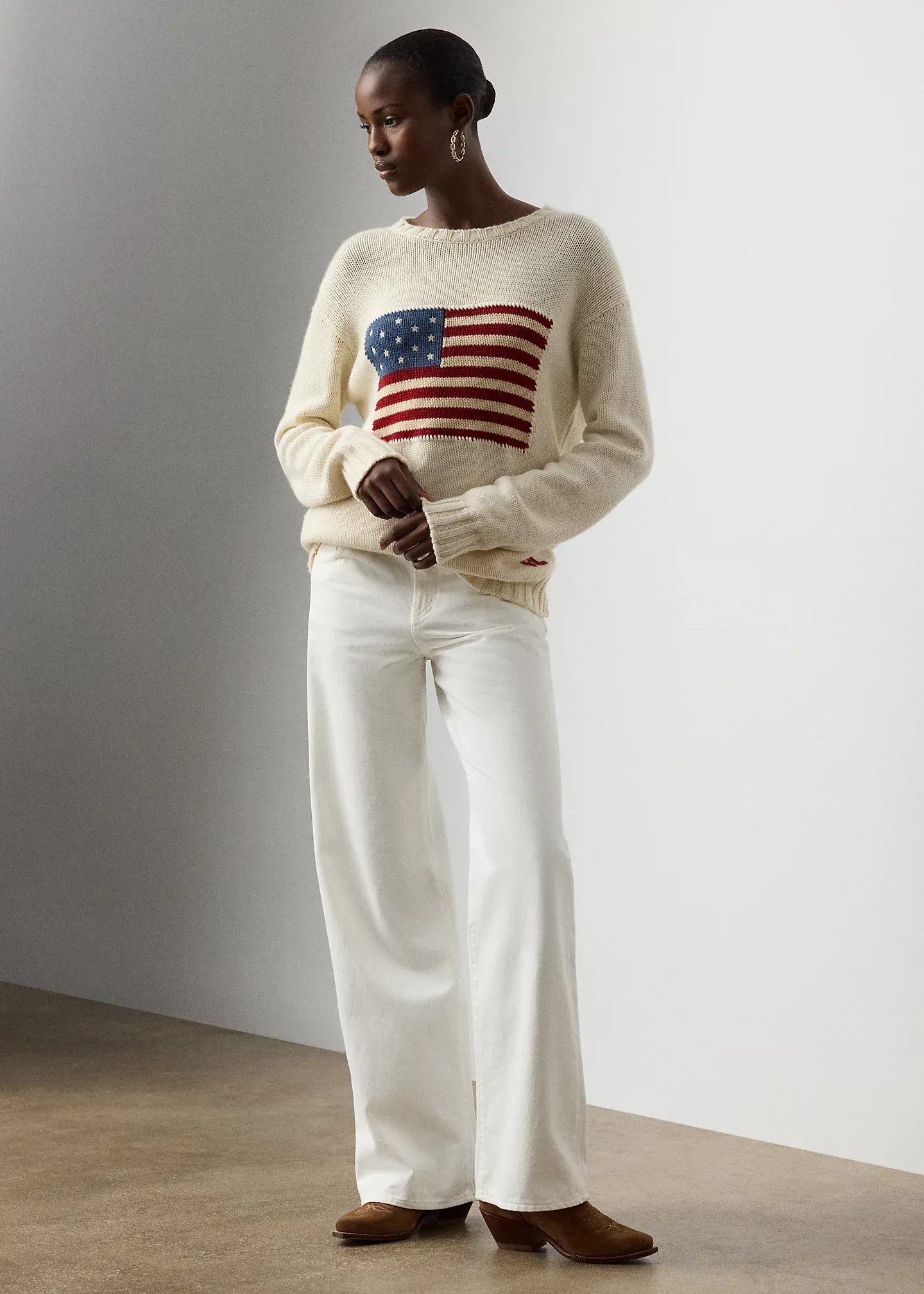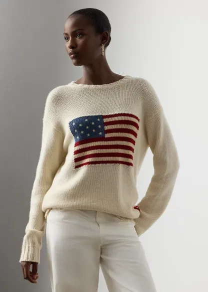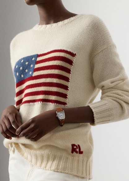 - Knit historical American flag at the front. Embroidered stars. Whipstitched border.
