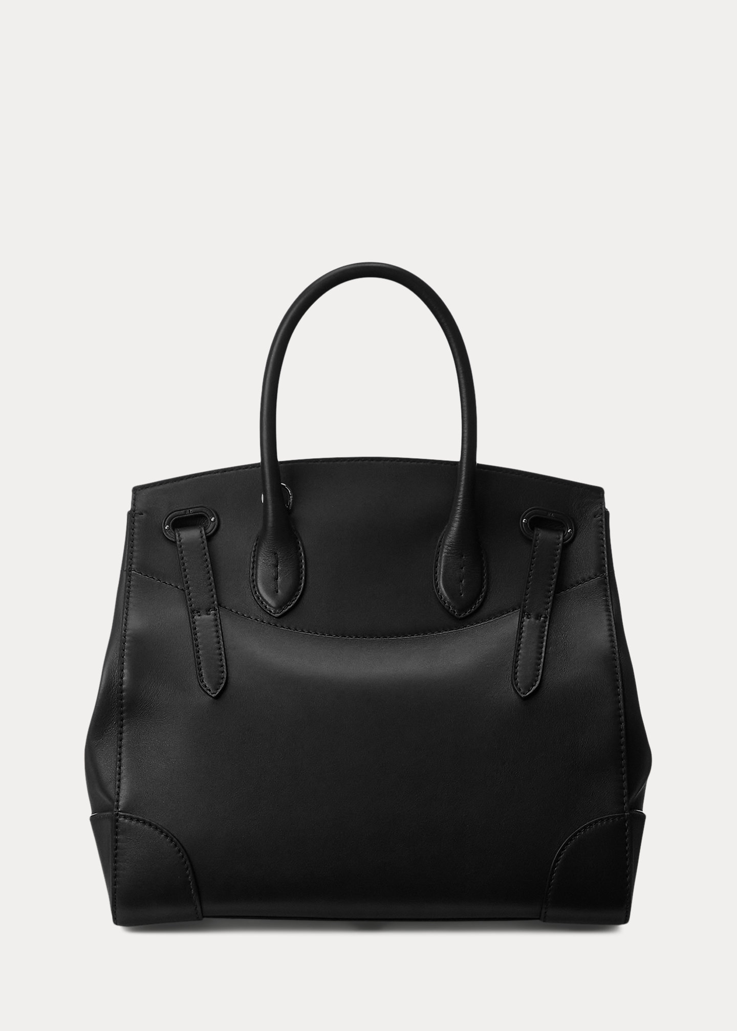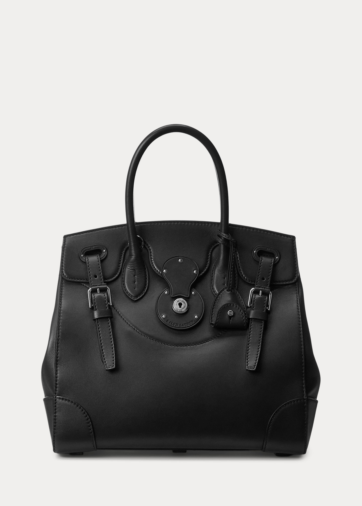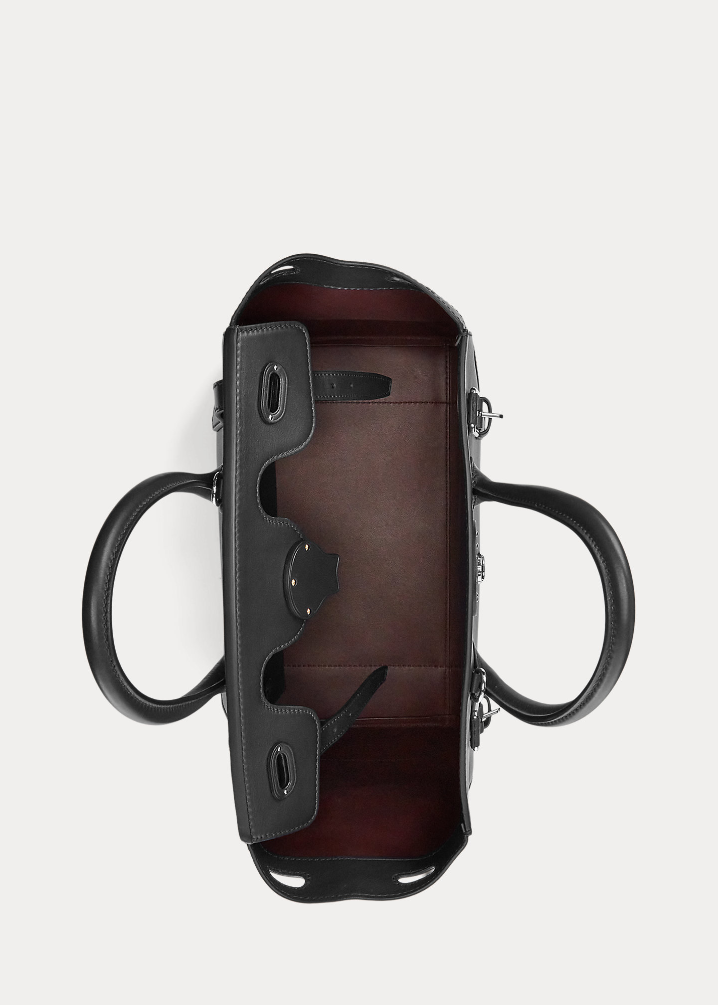 - Front flap secures with a calfskin-covered Ricky lock debossed with “ralthtph lauthtren.” Two calfskin straps loop through the front and secure with polished roller buckles. Two attached keys in a removable calfskin key bell.