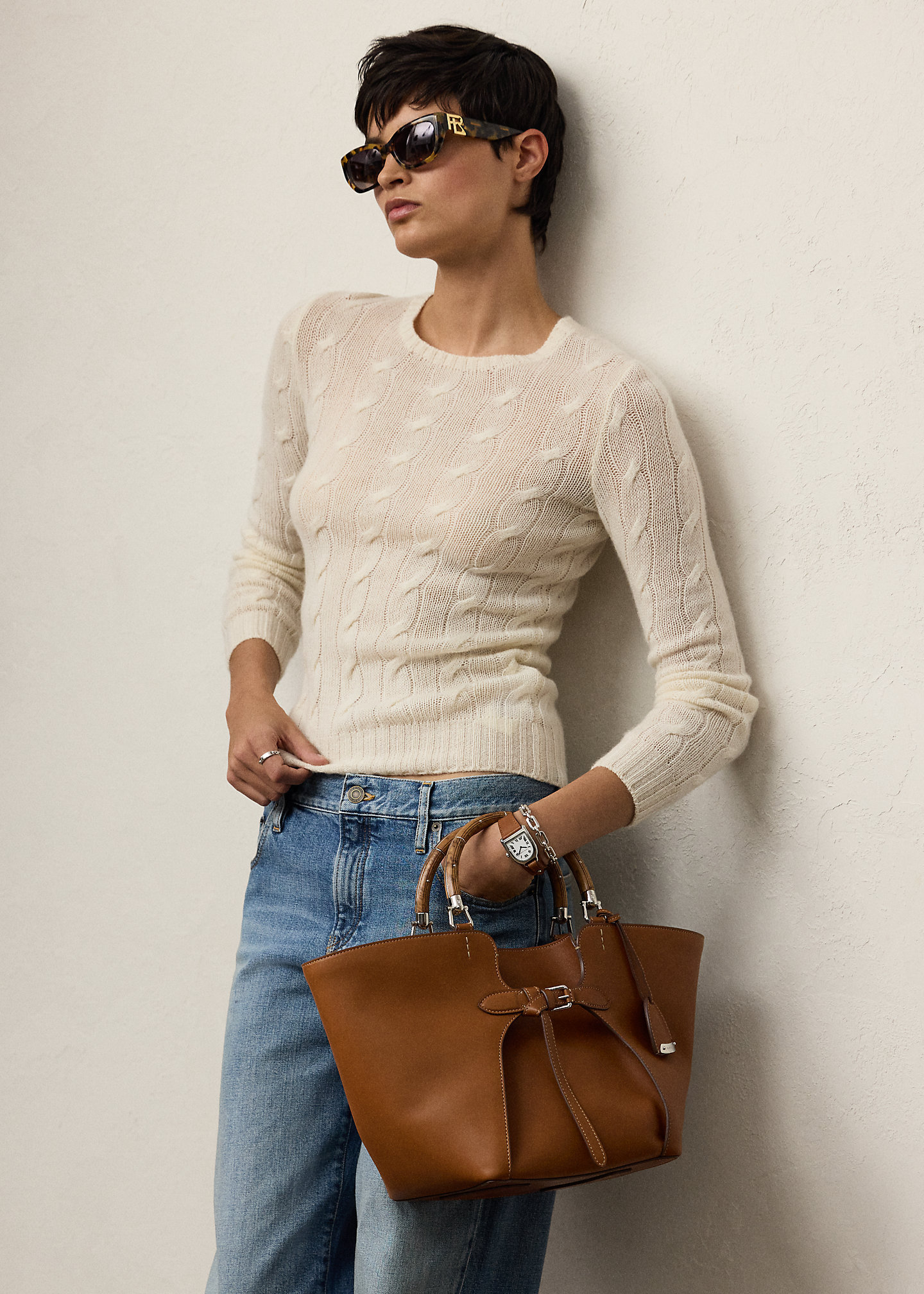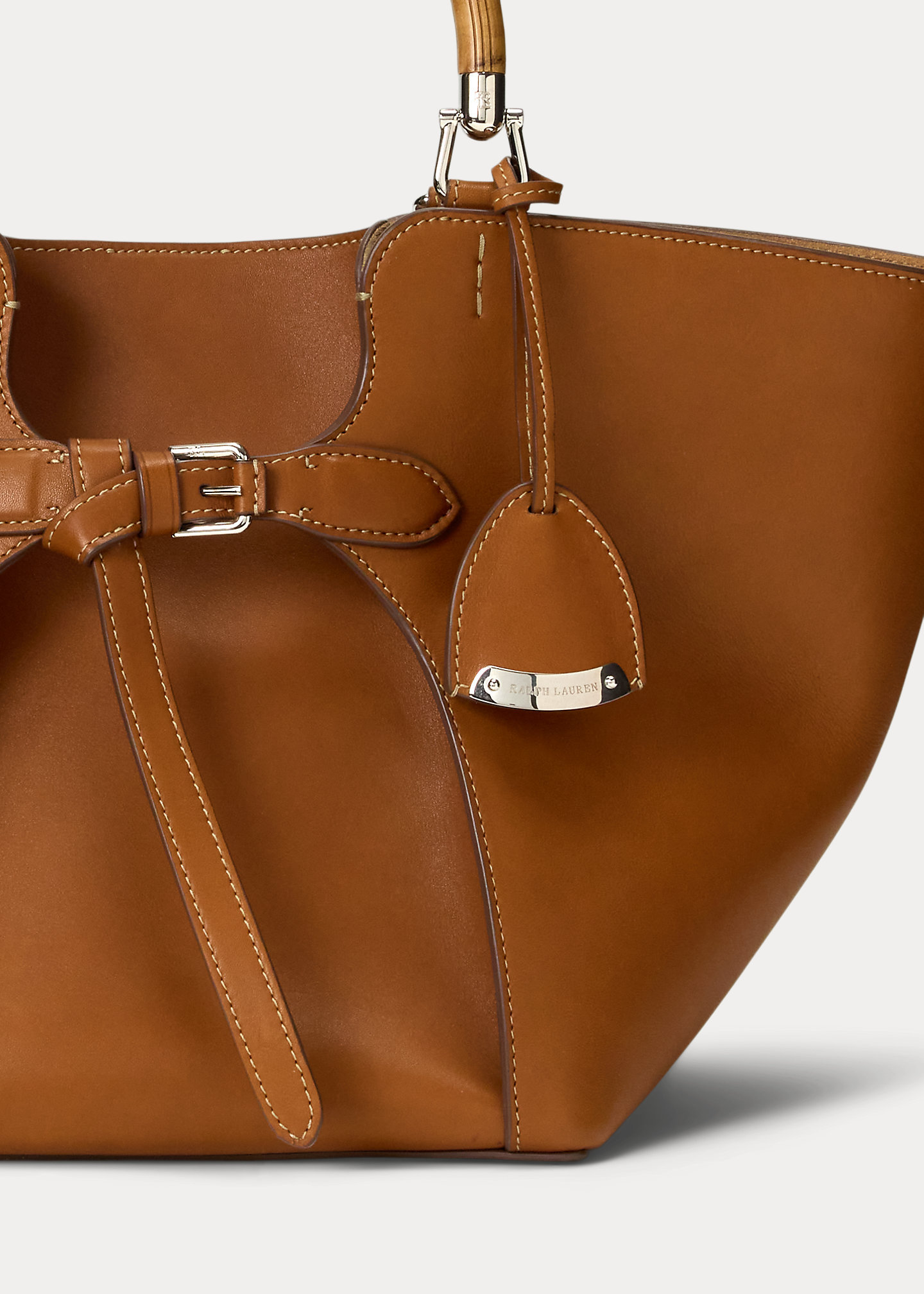 • Calfskin tabs at the back secure with a stud and two calfskin keepers. Debossed “ralthtph lauthtren Made in Italy” at the back of the bag.
