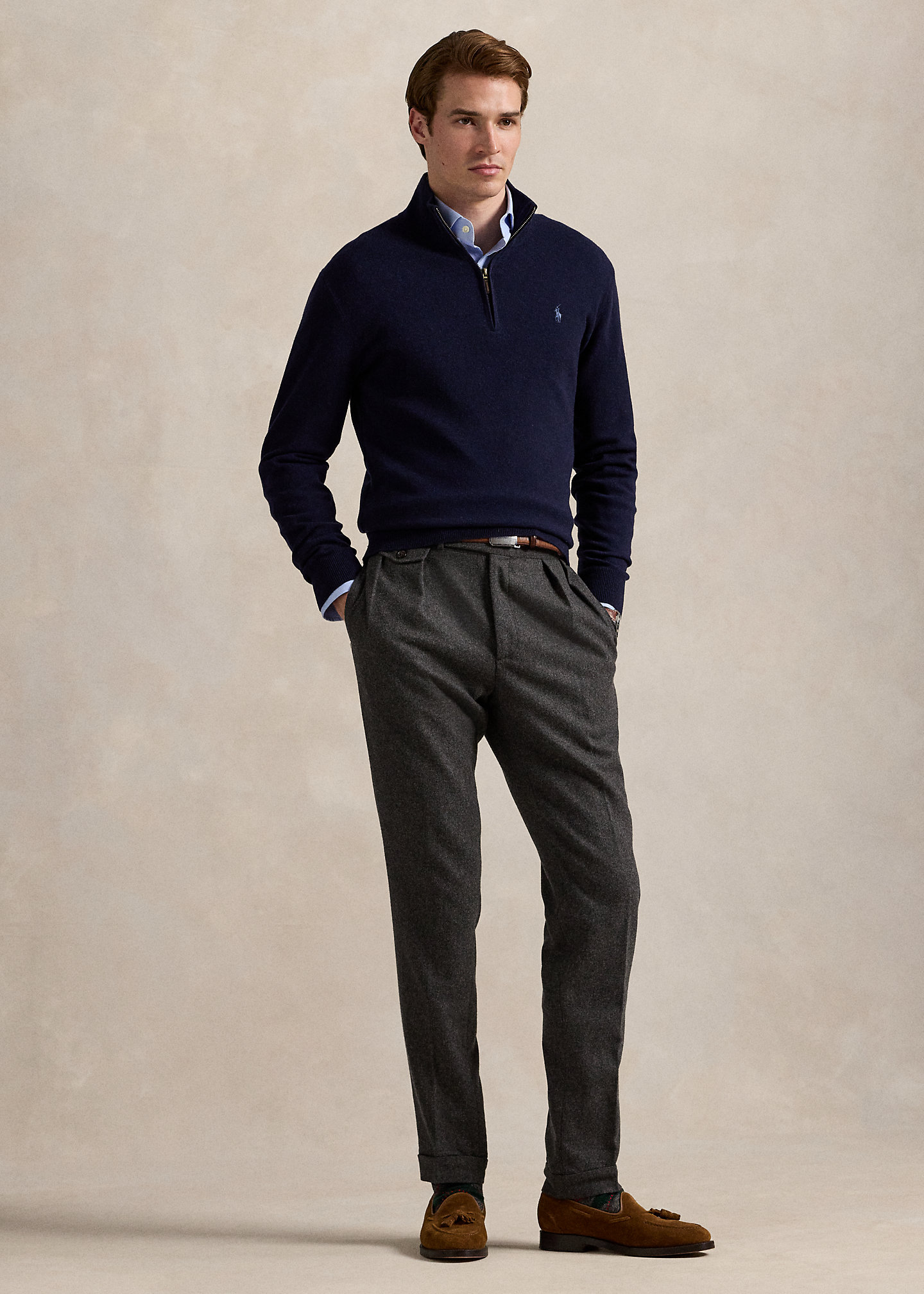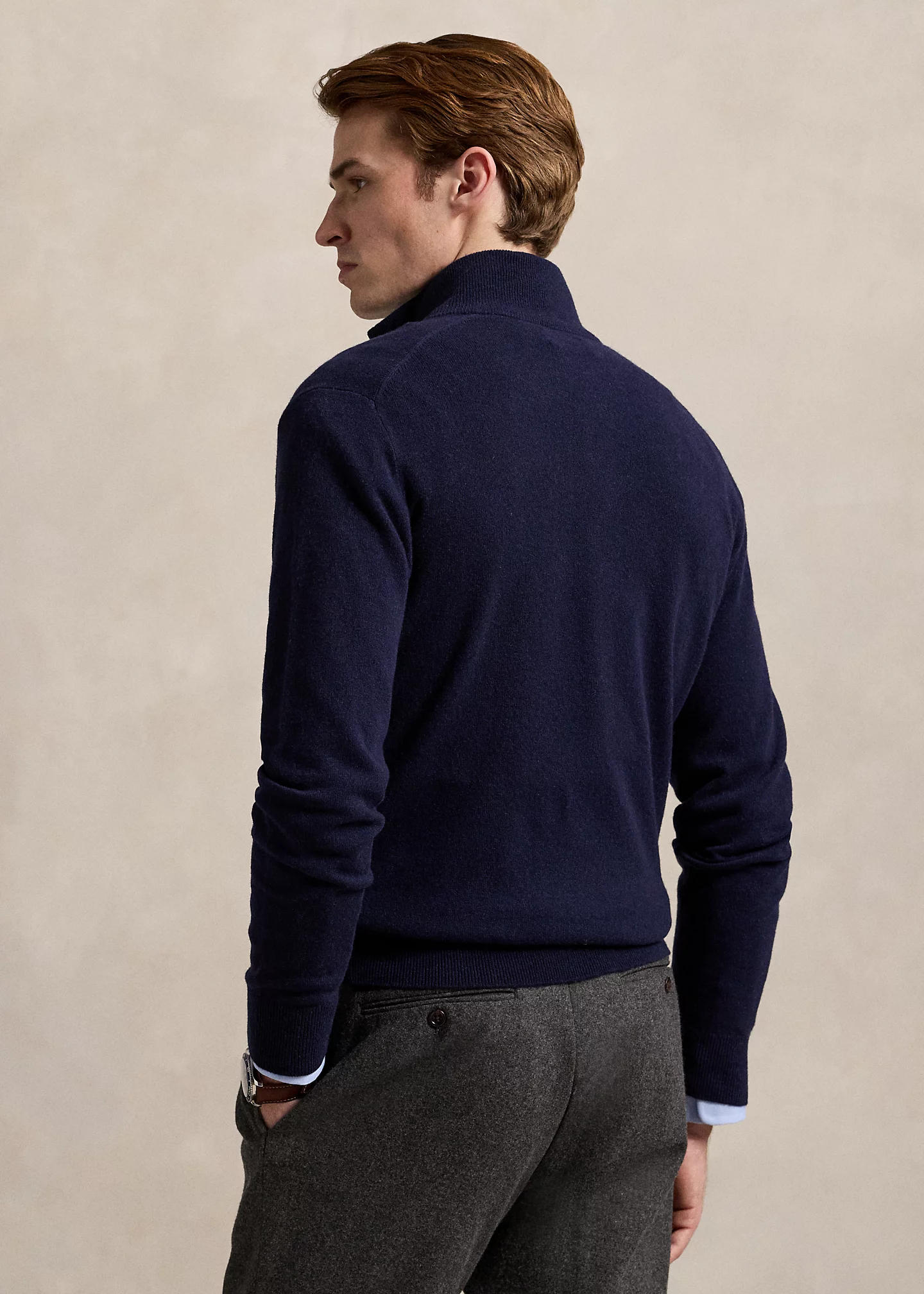 - Rib-knit mockneck. Quarter-zip front. Suede zipper pull custom-developed with a “Polo” logo. Faux-suede piping at the interior back of the neck.